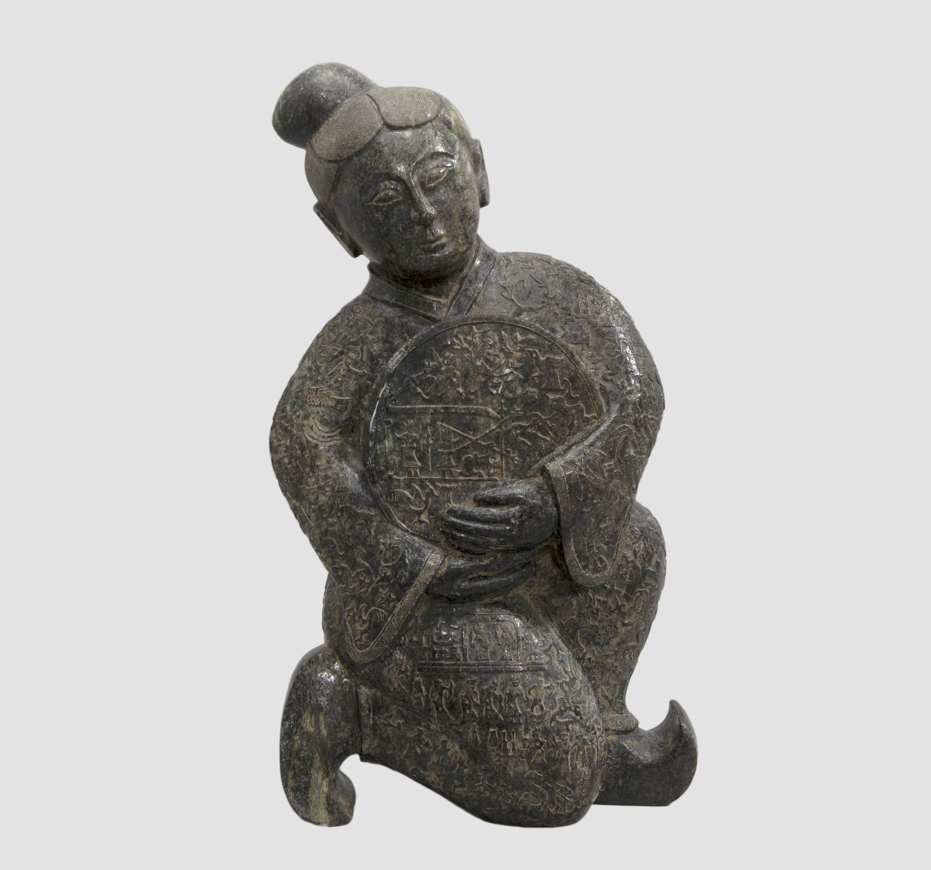 Guanyin sedente tallada en jade, con decoración incisa con una escena de pintura rupestre de la antigua China. En el disco central también se representa con decoración incisa una escena de pueblos antiguos, los cuales ofrecen sacrificios y rezan por la paz y el buen tiempo.