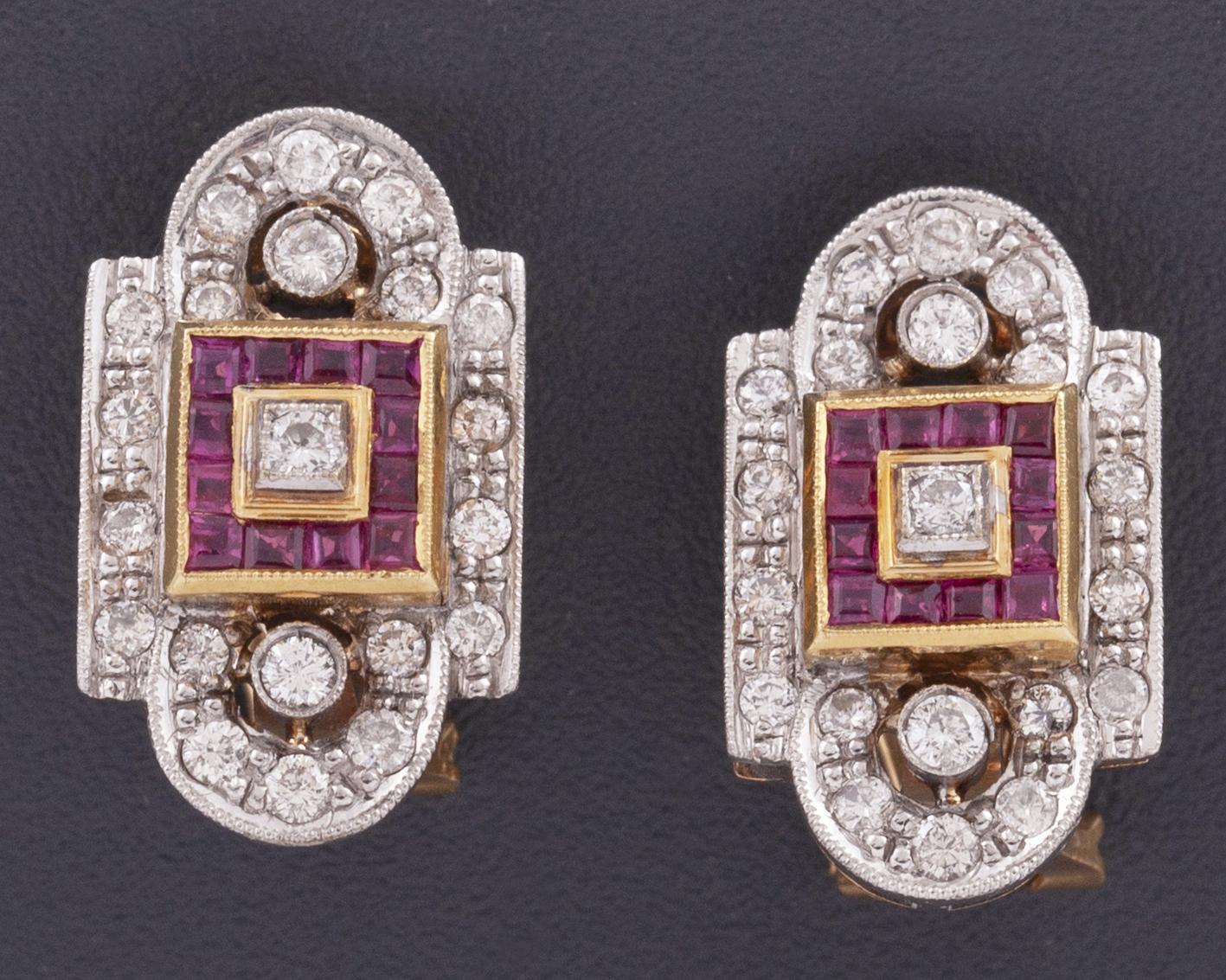 Pendientes estilo Chevalier realizados en oro de 18 kt con vistas en oro blanco todo ello cuajados de diamantes en talla brillante de aprox 0.50 ct y rubís en talla carrer de aprox 0.20 ct