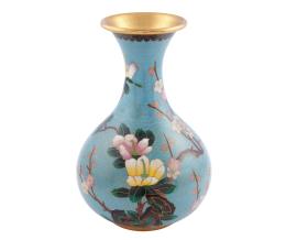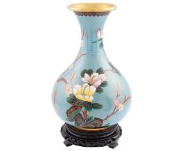 <span class='ref_item'>190 -</span> <span class="object_title">JARRÓN CON ESMALTE CLOISONNÉ AZUL</span>   <p><span class="technical_description">Jarrón de cuello estrecho estilo chino. Con esmalte cloisonné azul celeste e imágenes de flores. Boca e interior dorados<br/>Altura: 26cm</span><br></p>