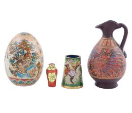 <span class='ref_item'>192 -</span> <span class="object_title">LOTE DE HUEVO PINTADO A MANO Y TRES OBJETOS EN CERÁMICA</span>   <p><span class="technical_description">Huevo Satsuma decorado a mano con motivos figurativos y florales y detalles en oro. Medidas: 11cm<br/>Pequeña reproducción de Enócoe griego pintado a mano. Con inscripción en la base. Medidas: 12cm<br/>Dos jarrones en miniatura en cerámica policromada y otro en metal dorado con decoración esmaltada de motivos florales. Medidas: 4cm; 6cm.</span><br></p>