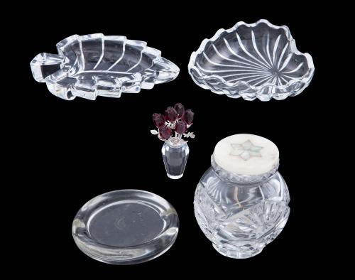 <span class='ref_item'>198 -</span> <span class="object_title">LOTE DE CINCO PIEZAS EN CRISTAL TALLADO</span>   <p><span class="technical_description">Lote formado por cinco objetos en cristal tallado. Tres ceniceros en forma circular y dos hojas, frasco en cristal con tapa y jarrón de flores con aplicaciones en cristal teñido. </span><br></p>