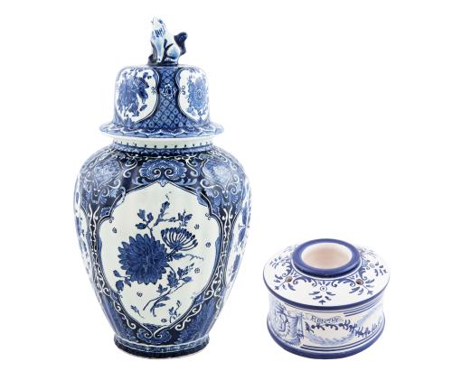 <span class='ref_item'>207 -</span> <span class="object_title">TIBOR Y TINTERO EN CERÁMICA POLICROMADA CON SELLO DE LOS REALES SITIOS Y DELFT BOCH</span>   <p><span class="technical_description">Tintero de la contaduría de rentas realizado en cerámica policromada con sello en la base de los Reales Sitios de España. Con tiene en el interior certificado de reproducción con fecha 1996. Medidas: 8x6cm<br/>Tibor realizado en cerámica policromada de Delft con motivos florales con tapa. En la base, sello Delft Boch. Medidas: 39cm</span><br></p>