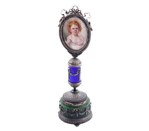 <span class='ref_item'>69 -</span> <span class="object_title">PORTARRETRATOS "FABERGÉ"  EN PLATA DE LEY Y RETRATO POR AUGUSTE DELACROIX (Boulogne-sur-Mer, 1809-1868), S. XIX  </span>  <p><span class="technical_description">Portaretratos realizado en plata de ley con base de mármol verde y fuste de esmalte cloisonné azul, decorado con motivos de guirnaldas y laureados con brillantes. Muestra el retrato de un bebé rubio de pelo rizado, realizado sobre una plancha fina de marfil. Firmado por Auguste Delacroix en zona lateral izquierda.<br/>Punzones: Plata (88 y cabeza), Fabergé (en cirilico), Estado Ruso (Cabeza) y punzones de orfebre (H,M) pertenecientes a Henrik Wickstrom. Estos punzones se repiten en cada una de las partes que conforman la pieza. </span><br>Peso: <span class="PESO_HCES1">334,60</span> <span class="PESOUMED_HCES1">gr.</span><br></p>