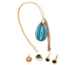 <span class='ref_item'>91 -</span> <span class="object_title">LOTE DE 4 PIEZAS CHAPADAS EN ORO</span>  <p><span class="technical_description">-Colgante con piedra color turquesa, con negro y marrón con 6 cadenitas colgantes. Cadena barbada de 44cm con cierre de reasa. Peso: 21,5gr<br/>-Par de gemelos con placas ovales de ónix. Señales de uso. Peso: 7,4gr<br/>-Sortija con diseño de Ying-Yang con placas negras pulidas. Medida sortija: 15. Peso: 3,2gr<br/>-Colgante con forma de concha con perla central. Peso: 2,1gr<br/> </span><br></p>