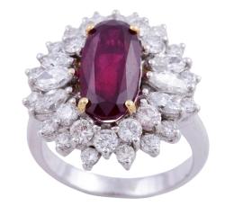 <span class='ref_item'>148 -</span> <span class="object_title">SORTIJA EN ORO 18KT, RUBÍ Y DIAMANTES</span>  <p><span class="technical_description">Sortija realizada en oro de 18kt con rubí natural sin tratamiento térmico en talla oval, engastado en garras de oro amarillo, con peso 4.56ct. Orla de diamantes en talla brillante y marquise con peso total aprox de 2.50ct<br/>Medida Sortija: 12</span><br>Peso: <span class="PESO_HCES1">9,50</span> <span class="PESOUMED_HCES1">gr.</span><br></p>