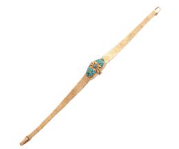 <span class='ref_item'>157 -</span> <span class="object_title">RELOJ PROGRESS EN ORO 14KT CON TAPA. CUERDA MANUAL</span>  <p><span class="technical_description">Reloj Progress con caja y brazalete realizados en oro 14kt. Movimiento de cuerda manual. Caja de 16 x 8mm con tapa que oculta la esfera y se levanta de un lado, adornada por turquesas en talla redonda. No en estado de marcha</span><br>Peso: <span class="PESO_HCES1">30,60</span> <span class="PESOUMED_HCES1">gr.</span><br></p>
