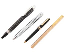<span class='ref_item'>149 -</span> <span class="object_title">CUATRO BOLÍGRAFOS</span>  <p><span class="technical_description">Lote formado por 4 bolígrafos: Tres Montblanc de los cuales uno gama Meisterstück pequeño lacado en negro y dos con diseño de cuadrícula. Junto a ellos un Élysée en dorado y estriado<br/> </span><br>Peso: <span class="PESO_HCES1">112</span> <span class="PESOUMED_HCES1">gr.</span><br></p>