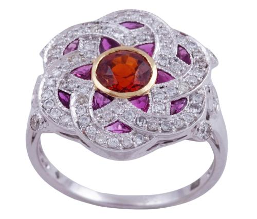 <span class='ref_item'>158 -</span> <span class="object_title">SORTIJA EN ORO 18KT, ESPESARTINA, RUBÍES Y DIAMANTES</span>  <p><span class="technical_description">Sortija estilo Art Déco realizada en oro de 18kt con granate espesartina central en talla redonda engastado en chatón con vistas en amarillo y peso aprox 0.65ct. Rodeado de diamantes en talla brillante, engastados en grano y chatón con peso total aprox de 0.45ct y rubíes en talla fantasía y trillón con peso aprox de 0.10ct.<br/>Medida Sortija: 11</span><br>Peso: <span class="PESO_HCES1">4,50</span> <span class="PESOUMED_HCES1">gr.</span><br></p>