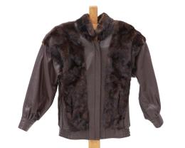 <span class='ref_item'>195 -</span> <span class="object_title">CHAQUETA EN PIEL DE VISÓN Y CUERO MARRÓN</span>   <p><span class="technical_description">Chaqueta en cuero con piel de visón en cuello, mangas, costados y espalda. Mangas con gomas, bolsillos laterales. Talla 40 aprox.</span><br></p>