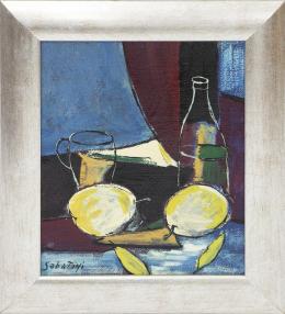 <span class='ref_item'>60 -</span> <span class="object_title">BODEGÓN CON MANZANAS Y BOTELLA, S.XX</span>   <p><span class="author">RAFAEL SABATINI (Filadelfia, 1898-1953)</span> <br><span class="technique_material">Óleo sobre lienzo</span><br><span class="technical_description">Bodegón con vaso y botella de cristal con un par de manzanas, sobre un fondo en tonos azules y rojos de carácter cubista.<br/>Firmado en el ángulo inferior izquierdo. <br/>Enmarcado<br/>Medidas: 42 x 37cm con marco<br/>Estimación de mercado: 150-180&euro;</span><br></p>