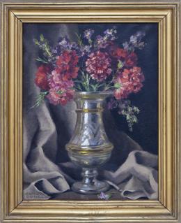 <span class='ref_item'>50 -</span> <span class="object_title">FLORERO CON CLAVELES, 1946</span>   <p><span class="author">JUAN MIGUEL SANCHEZ (Puerto de Santa María, 1899 - Sevilla 1973)</span> <br><span class="technique_material">Óleo sobre lienzo</span><br><span class="technical_description">Firmado y fechado en el ángulo inferior izquierdo.<br/>Enmarcado. Marco con desperfectos<br/>Medidas: 65 x 50cm con marco<br/>Estimación de mercado: 250-300&euro;</span><br></p>