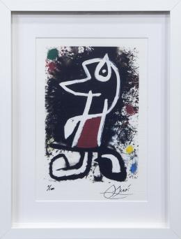 <span class='ref_item'>49 -</span> <span class="object_title">PERSONAJE (1972)</span>   <p><span class="author">JOAN MIRÓ ( Barcelona,  1893- Mallorca, 1983)  </span> <br><span class="technique_material">Impresión a color sobre papel guarro firmado a mano por el autor</span><br><span class="technical_description">Representa la obra realizada por el autor, una figura en trazos blancos y negros sobre un fondo de color negro con detalles. <br/>Firmada y numerada 2/100 a mano por el artista, según certificado adjunto.<br/>Enmarcado con metacrilato<br/>Acompaña certificado de autenticidad firmado y emitido por Royal Palace Gallery, con sello oficial, lacrado y en seco en dorado.<br/>Medidas con marco: 42x32cm</span><br></p>