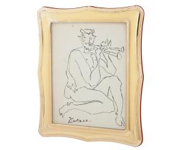 <span class='ref_item'>58 -</span> <span class="object_title">IMPRESIÓN DEL DIBUJO "FAUNO TOCANDO LA FLAUTA" DE PABLO PICASSO (Málaga, 1881 - Mougins, 1973)  </span>   <p><span class="technical_description">Firmado en plancha en el ángulo inferior izquierdo<br/>En marco de metal dorado. La parte trasera es de imitación de madera con soporte para sujeción del mismo<br/>Medidas: 25 x 20cm</span><br></p>