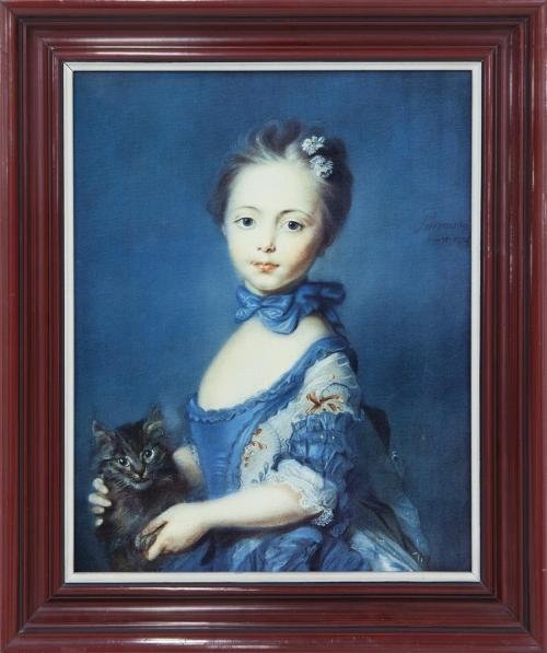 <span class='ref_item'>44 -</span> <span class="object_title">IMPRESIÓN SOBRE LIENZO DE LA PINTURA ORIGINAL "FILLETTE AU CHAT" (1743)        .<br/>DE JEAN-BAPTISTE PERRONNEAU (París, 1715-Ámsterdam, 1783)</span>   <p><span class="technical_description">El original se encuentra expuesto en el National Gallery (Londres). Representa a una niña de la nobleza francesa con tez pálida y con un rico vestido azulado con pequeños motivos florales. A la izquierda se muestra un gato.<br/>Firmado y fechado en el margen superior derecho.<br/>Enmarcado.<br/>Medidas con marco: 63 x 53cm</span><br></p>