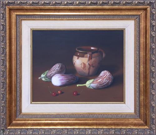 <span class='ref_item'>61 -</span> <span class="object_title">BODEGÓN DE BERENJENAS Y CEREZAS</span>   <p><span class="author">ESCUELA ESPAÑOLA CONTEMPORÁNEA  </span> <br><span class="technique_material">Óleo sobre lienzo</span><br><span class="technical_description">Muestra un bodegón siguiendo modelos de los bodegones españoles del siglo XVII, mostrando unas berenjenas y cerezas en un primer plano y, de fondo, una olla de barro con dos asas.<br/>Firmado en el ángulo inferior derecho "Herrero".<br/>Enmarcado cado en madera tallada y parcialmente dorada con paspartú.<br/>Medidas con marco: 56,8x65,6cm</span><br></p>