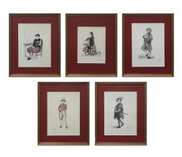 <span class='ref_item'>89 -</span> <span class="object_title">CONJUNTO DE 5 ACUARELAS DE PERSONAJES DECIMONÓNICOS</span>   <p><span class="technique_material">Acuarela sobre papel</span><br><span class="technical_description">Muestran personajes masculinos vestidos con atuendos de la época del siglo XIX.<br/>Firmados Fay y fechados en Roma &#39;34.<br/>Enmarcado en madera dorada y cristal. <br/>Medidas: 40 x 34cm con marco</span><br></p>