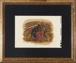 <span class='ref_item'>85 -</span> <span class="object_title">PASE TAURINO</span>   <p><span class="author">HORACIO GONZALEZ NEIRA (Alicante, 1942)</span> <br><span class="technique_material">Acuarela sobre papel</span><br><span class="technical_description">Acuarela realizada en tonos ocres y pincelada rápida, representando a un torero haciendo un pase natural.<br/>Firmado por el autor en el ángulo inferior izquierdo.<br/>Enmarcado en madera dorada y cristal.<br/>Medidas marco:45,5x54cm</span><br></p>