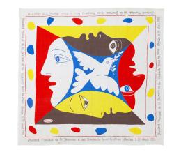 <span class='ref_item'>91 -</span> <span class="object_title">IMPRESIÓN TEXTIL PARA "FOULARD DU FESTIVAL MONDIAL DE LA JEUNESSE ET DES ÉTUDIANTS POUR LA PAIX" (1951)</span>   <p><span class="author">PABLO RUÍZ PICASSO (Málaga, 1881 - Mougins, 1973)  </span> <br><span class="technical_description">Fular serigrafiado a color mostrando en el centro rostros y una paloma. Alrededor de estos se muestran manchas de color y a su vez un ribete por todo el fular con la inscripción: "Festival mondial de la Jeunesse et des Étudiants pour la Paix. Berlín 5.19. Aout 1951".<br/>Firmado en el ángulo inferior izquierdo<br/>Medidas: 81x78 cm</span><br></p>