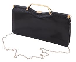 <span class='ref_item'>104 -</span> <span class="object_title">CARTERA EN PIEL DE SERPIENTE NEGRA</span>   <p><span class="technical_description">Señales de uso. Con correa platerada, dos asas. Interior con un bolsillo con cremallera.</span><br></p>