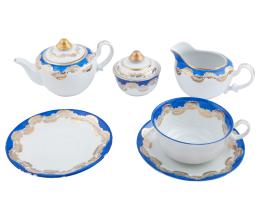<span class='ref_item'>105 -</span> <span class="object_title">JUEGO DE CAFÉ INDIVIDUAL EN PORCELANA CHINA, S. XX</span>   <p><span class="technical_description">Formado por 6 piezas decoradas con motivos en color azul y dorado a mano. Tetera, azcarero, lechera, taza, plato de postre y sobreplato.<br/>Con sello dorado en la base. <br/> </span><br></p>
