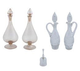 <span class='ref_item'>99 -</span> <span class="object_title">LOTE CAMPANILLA DE CRISTAL, DOS VINAJERAS DE CRISTAL Y DOS DECANTADORES DE VINO. (S.XX)</span>   <p><span class="technique_material">Cristal</span><br><span class="technical_description">- Campanilla de cristal: Cristal soplado y grabado. Empuñadura lisa con cuerpo ancho. Cadena en bola de cristal. Medidas altura: 12,5cm. Peso: 12,02gr<br/>- Dos vinajeras de cristal: Cristal modelado y grabado. Boca con empuñadura estilizada y cuerpo ovoide con franjas. Tapón con decoración geométrica. Medidas altura: 27cm. Peso: 51,07gr<br/>-Dos decantadores de vino: Cristal modelado. Boca estrecha, cuello estilizado y cuerpo ovoide. Pie plano circular. Tapón incluido. Medidas altura: 29,8cm. Peso: 454gr</span><br></p>