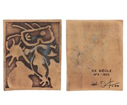 <span class='ref_item'>95 -</span> <span class="object_title">"XX SIÈCLE, Nº 4 - 1938"</span>   <p><span class="author">JOAN MIRÓ (Barcelona, 1893 - Mallorca, 1983)</span> <br><span class="technique_material">Bronce patinado</span><br><span class="technical_description">Bajorrelieve en bronce patinado con el diseño de grabado realizado por Miró "Femme pour XXe Siècle" de 1938. Editado para la cuarta edición de la revista de arte parisina XXe Siècle.<br/>Firmado en plancha en el anverso. En el reverso, titulado y fechado junto al sello de la fundación Joan Miró.<br/>Medidas plancha: 11x8,5cm<br/>Peso: 476,6gr</span><br></p>