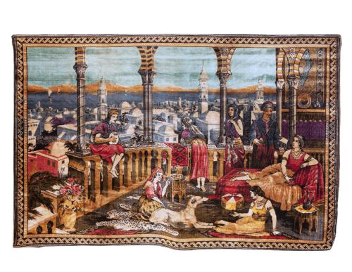 <span class='ref_item'>92 -</span> <span class="description">GRAN TAPIZ EN LANA "ESCENA ORIENTAL" </span>  <p><span class="description">Tapiz realizado en lana de varios colores, representando una escena oriental en la que destacan varios cortesanos en un interior palaciego y, como telón de fondo, la ciudad. Enmarcada en una cenefa en color dorado y negro.<br>Leve descosido en parte inferior del largo izquierdo.<br>Medidas: 118x180cm</span></p>