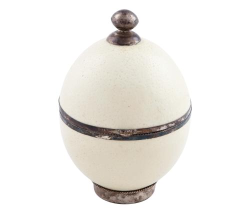 <span class='ref_item'>100 -</span> <span class="object_title">HUEVO DE AVESTRUZ TRANSFORMADO EN CUENCO CON TAPA CON DETALLES EN PLATA (S.XX)</span>   <p><span class="technique_material">Cincelado</span><br><span class="technical_description">Cincelado con remate, pie y collar en plata 800 m/m. Parte superior con remate de borla y parte inferior con pie de plata. 2 marcas de la orfebrería con pequeña inscripción. Medidas altura: 19 cm Diámetro: 13 cm.</span><br></p>