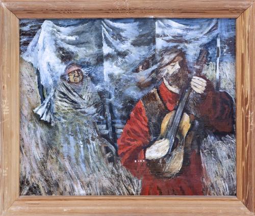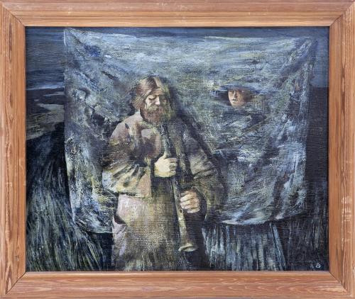 <span class='ref_item'>87 -</span> <span class="object_title">FLAUTISTA (S.XX)</span>   <p><span class="author">BORIS DOSEKIN (Rusia, 1948-2006)</span> <br><span class="technique_material">Óleo sobre táblex</span><br><span class="technical_description">Representa a una persona tocando una flauta mientras es observado por una mujer tras una cortina. El artista utilizó una paleta de colores apagados como ocres y grises que simbolizan la dureza de la vida y la lucha por al supervivencia.<br/>Firmado con anagrama en el ángulo inferior derecho<br/>Medidas: 57 x 47cm sin marco</span><br></p>