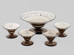 <span class='ref_item'>163 -</span> <span class="object_title">JUEGO DE PEQUEÑA PONCHERA  Y CUATRO COPAS EN VIDRIO SOPLADO. CA.1920</span>   <p><span class="technical_description">Realizados en vidrio soplado en tono ahumado con decoración dorada a modo de cenefa con personajes tocando instrumentos y bailando.<br/>Presentan piquetes en las bocas.</span><br></p>