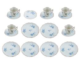 <span class='ref_item'>165 -</span> <span class="object_title">JUEGO DE CAFÉ EN PORCELANA, PPCIOS. S. XX</span>   <p><span class="technical_description">Formado por 5 tazas, 6 platitos y 6 platos de postre. Borde curvo en color azul, con algunas faltas de policromía. Cada pieza decorada con motivos decorativos finos.</span><br></p>