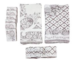 <span class='ref_item'>152 -</span> <span class="object_title">LOTE DE DOS MANTELERÍAS EN HILO BLANCO Y MARRÓN, S.XX</span>   <p><span class="technical_description">-Juego de mantelería de 6 servicios compuesto por mantel grande y seis servilleta. Cada pieza bordada y decorada con motivos florales.<br/>-Juego de mantelería de 12 servicios, compuesto por mantel grande y doce servilletas. Cada pieza decorada con motivos florales y rombos.</span><br></p>