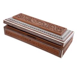 <span class='ref_item'>156 -</span> <span class="object_title">PURERA DE MADERA TALLADA INDO-INGLESA (S.XIX)</span>   <p><span class="technique_material">Marquetería con hueso</span><br><span class="technical_description">Marquetería con detalles en hueso. Purera tallada a mano y bordeada con incrustaciones. La parte superior presenta una gran ornamentación con motivos florales y animales típicos de la cultura indú. En el centro se observa una hoja en forma de almendra con estos animales. Está enmarcado con incrustaciones de hueso y madera haciendo formas geométricas. Cada panel inferior presenta placas de madera tallada a mano con motivos florales enmarcadas con un borde de incrustaciones de hueso y madera en formas geométricas. <br/>Sin llave. Presenta fractura en la madera de la base.<br/>Medidas: 8x31x13 cm.</span><br></p>