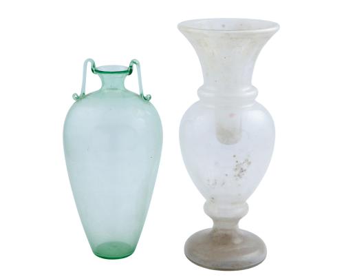 <span class='ref_item'>150 -</span> <span class="object_title">PAREJA DE JARRONES EN VIDRIO, S.XX</span>   <p><span class="technical_description">Lote de dos jarrones. Uno de ellos en vidrio verde con dos pequeñas asas y otro en vidrio antiguo blanco con oquedad para recoger el agua.<br/>Altura: 20cm el verde, 24cm el blanco</span><br></p>