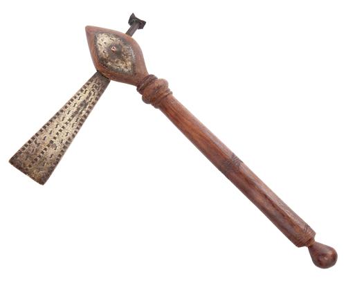 <span class='ref_item'>158 -</span> <span class="object_title">HACHA DE MADERA TORNEADA CON DETALLES GEOMÉTRICOS EN EL MANGO</span>   <p><span class="technique_material">Madera torneada y bronce</span><br><span class="technical_description">Alude a las armas tomahawk por su forma. <br/>La cabeza de bronce presenta una ornamentación labrada con marcas.<br/>Medidas cabeza: 15 cm.</span><br></p>