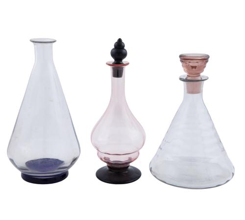 <span class='ref_item'>155 -</span> <span class="object_title">LOTE. LICORERA Y DOS DECANTADORES DE VINO DE CRISTAL. (S.XX)</span>   <p><span class="technique_material">Cristal</span><br><span class="technical_description">- Licorera de cristal: Cristal modelado. Boca estrecha, cuello estilizado y cuerpo ovoide rosa. Pie plano circular. Incluye tapón lobulado en pasta. Medidas altura: 24cm. Peso: 352,3gr<br/>- Dos decantadores de vino de cristal: Cristal modelado. Boca estrecha, cuello corto, cuerpo triangular. Uno de ellos presenta pie grueso de color azul. Uno con tapón lobulado de color rosa. Medidas altura del decantador con tapón: 21 cm. Peso: 813,3gr. Medidas altura del decantador sin tapón: 25,5cm. Peso: 692gr</span><br></p>