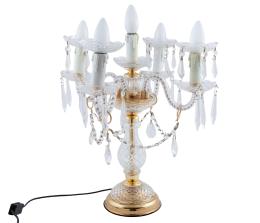 <span class='ref_item'>178 -</span> <span class="object_title">LÁMPARA DE MESA ESTILO CLÁSICO</span>   <p><span class="technical_description">En metal plateado y vidrio. Con cable de alimentación. Para cinco luces. En funcionamiento. Faltan piezas de adorno en uno de los focos.<br/>Medidas: 53cm</span><br></p>