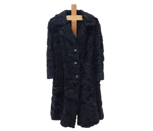 <span class='ref_item'>184 -</span> <span class="object_title">ABRIGO EN PIEL DE ASTRACÁN</span>   <p><span class="technical_description">Cuello solapa cuadrado con mangas rectas, cierre en cuatro botones. Bolsillos laterales. Forro interior negro con cinta ajustable. Forro interior descosido en una de las mangas. <br/>Talla 38 aprox</span><br></p>