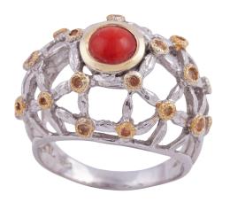 <span class='ref_item'>83 -</span> <span class="object_title">SORTIJA EN PLATA 925 CON CHAPADO EN ORO, CORAL Y ZAFIROS DORADOS. JOYERÍA DE AUTOR, PIEZA ÚNICA</span>  <p><span class="technical_description">Sortija realizada en plata de ley 925 con contraste y partes chapadas en oro. Diseño calado de red con coral central de peso aprox 0.40ct y zafiros dorados pequeños de peso total aprox 0.22ct<br/>Medida Sortija: 14</span><br>Peso: <span class="PESO_HCES1">6,40</span> <span class="PESOUMED_HCES1">gr.</span><br></p>