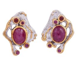 <span class='ref_item'>84 -</span> <span class="object_title">PENDIENTES EN PLATA 925 CON CHAPADO EN ORO, RUBÍES Y GRANATES. JOYERÍA DE AUTOR, PIEZA ÚNICA</span>  <p><span class="technical_description">Pareja de pendientes realizados en plata de ley 925 con contrastes y partes chapadas en oro. Adornados por cabujones ovales de rubíes con peso total aprox 2.60ct, rodeados por pequeños granates en talla redonda con peso total aprox 0.10ct.<br/>Cierre: Omega</span><br>Peso: <span class="PESO_HCES1">9,20</span> <span class="PESOUMED_HCES1">gr.</span><br></p>