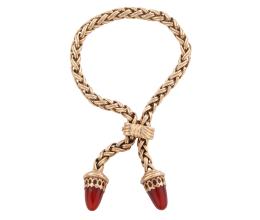 <span class='ref_item'>66 -</span> <span class="object_title">PULSERA EN ORO 18KT Y CORNALINAS</span>  <p><span class="technical_description">Pulsera realizada en oro de 18kt compuesta por un cordón trenzado. En los extremos dos cabujones de cornalinas con peso total aprox 6ct que quedan colgando. <br/>Cierre: Broche con pestaña y cadena de seguridad<br/>Longitud: 17cm (sin la parte colgante)</span><br>Peso: <span class="PESO_HCES1">53</span> <span class="PESOUMED_HCES1">gr.</span><br></p>