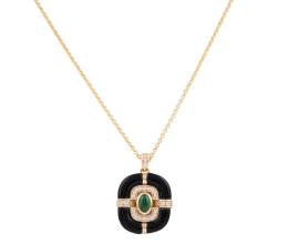 <span class='ref_item'>77 -</span> <span class="object_title">COLGANTE Y CADENA EN PLATA 925 CHAPADA EN ORO, ESMERALDA, ÓNIX Y CIRCONITAS</span>  <p><span class="technical_description">Colgante y cadena realizados en plata de ley 925 chapada en oro. El colgante con esmeralda en cabujón, con revestimiento de circonitas y ónix negro. Cadena barbada con cierre mosquetón<br/>Longitud de la cadena: 39cm (+5cm de alargador)</span><br>Peso: <span class="PESO_HCES1">7,70</span> <span class="PESOUMED_HCES1">gr.</span><br></p>