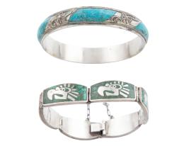 <span class='ref_item'>82 -</span> <span class="object_title">DOS BRAZALETES EN PLATA 925 CON PIEDRAS VERDES</span>  <p><span class="technical_description">Lote de dos pulseras-brazaletes realizadas en plata 925 con aplicaciones de piedra verde y azul. Una rígida de media caña con motivos florales y piedras azules. La otra articulada con placas alargadas de piedra verde y dibujo de cabeza de pájaro.<br/>Medidas: 7cm de díametro la de media caña y 18cm de longitud la articula<br/>Cierre: Caja con lengüeta y cadena de seguridad la articulada</span><br>Peso: <span class="PESO_HCES1">73,80</span> <span class="PESOUMED_HCES1">gr.</span><br></p>