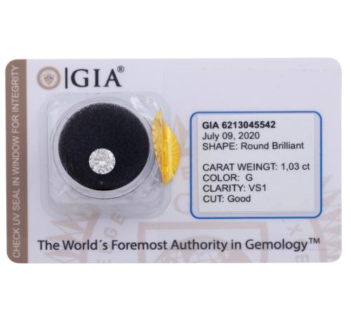 <span class='ref_item'>72 -</span> <span class="object_title">DIAMANTE NATURAL 1.03CT</span>  <p><span class="technical_description">Diamante natural en talla brillante, dentro de un blíster sellado. Se adjunta certificado GIA nº 6213045542, con sus características:<br/>Peso: 1.03ct<br/>Color: G<br/>Pureza: VS1</span><br></p>