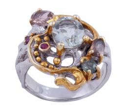 <span class='ref_item'>123 -</span> <span class="object_title">SORTIJA EN PLATA 925 CON CHAPADO EN ORO, PRASIOLITA, AMATISTA, ZAFIROS Y RUBÍES. JOYERÍA DE AUTOR, PIEZA ÚNICA</span>  <p><span class="technical_description">Sortija realizada en plata de ley 925 con contraste y partes chapadas en oro. Diseño calado adornado por prasiolita oval de peso aprox 1.80ct, amatista talla perilla con peso aprox 0.25ct, dos zafiros fansy en talla perilla con peso total aprox 0.15ct y dos pequeños rubíes redondos con peso total aprox 0.03ct.<br/>Medida Sortija: 17</span><br>Peso: <span class="PESO_HCES1">8,80</span> <span class="PESOUMED_HCES1">gr.</span><br></p>