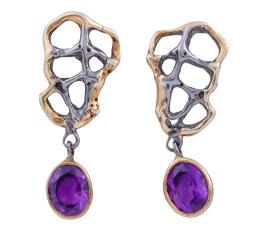 <span class='ref_item'>121 -</span> <span class="object_title">PENDIENTES EN PLATA 925 CON CHAPADO EN ORO Y AMATISTAS. JOYERÍA DE AUTOR, PIEZA ÚNICA</span>  <p><span class="technical_description">Pareja de pendientes realizados en plata de ley 925 con contrastes y partes chapadas en oro, largos con movimientos. Diseño calado y colgando tallas ovales de amatistas púrpuras con peso total aprox 2.25ct.<br/>Cierre: Presión<br/>Longitud: 3,50cm</span><br>Peso: <span class="PESO_HCES1">6,50</span> <span class="PESOUMED_HCES1">gr.</span><br></p>