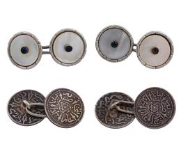 <span class='ref_item'>119 -</span> <span class="object_title">DOS PARES DE GEMELOS EN PLATA DE LEY, NÁCAR Y METAL</span>  <p><span class="technical_description">Lote formado por dos pares de gemelos. Uno realizado en plata de ley 925 con diseño de monedas con inscripciones y motivos árabes. El otro realizado en metal con diseño redondo, placas de nácar, piedras azules en el centro (falta una de las piedras) y firmado "DRGM"<br/>Diámetro: 1,5cm </span><br>Peso: <span class="PESO_HCES1">11</span> <span class="PESOUMED_HCES1">gr.</span><br></p>