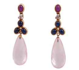 <span class='ref_item'>116 -</span> <span class="object_title">PENDIENTES EN ORO 18KT, ZAFIROS, RUBÍES, DIAMANTES Y CUARZOS ROSAS</span>  <p><span class="technical_description">Pareja de pendientes realizados en oro de 18kt. Parte superior formada por diamamtes en talla brillante con peso total aprox 0.09ct, zafiros en cabujón oval con peso total aprox 1.50ct y rubíes en cabujón oval con peso total aprox 0.40ct. Rematados por dos cuarzos rosas facetados en forma de gota<br/>Cierre: Omega<br/>Longitud: 5cm</span><br>Peso: <span class="PESO_HCES1">13,20</span> <span class="PESOUMED_HCES1">gr.</span><br></p>