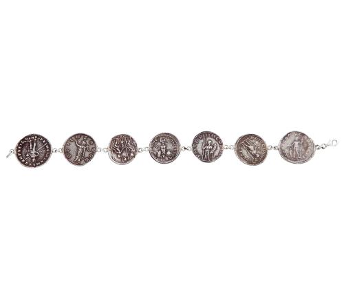 <span class='ref_item'>124 -</span> <span class="object_title">PULSERA EN PLATA DE LEY CON DENARIOS</span>  <p><span class="technical_description">Pulsera realizada en plata de ley. Compuesta por 7 denarios de antiguos emperadores romanos<br/>Cierre: Mosquetón<br/>Longitud: 19cm</span><br>Peso: <span class="PESO_HCES1">24,10</span> <span class="PESOUMED_HCES1">gr.</span><br></p>