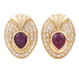 <span class='ref_item'>174 -</span> <span class="object_title">PENDIENTES EN ORO 18KT, RUBÍES Y DIAMANTES</span>  <p><span class="technical_description">Pareja de pendientes realizados en oro de 18kt, con contrastes. Compuestos por motivos con forma de elipse, decorados por gallones y rubíes centrales en talla cabujón perilla, engastados en bisel, con un peso total aprox de 3ct. Con galería cuajada por diamantes en talla brillante, engastados en grano, con un peso total aprox de 0.75ct.<br/>Cierre: Omega</span><br>Peso: <span class="PESO_HCES1">11,80</span> <span class="PESOUMED_HCES1">gr.</span><br></p>